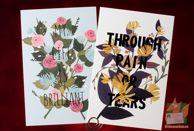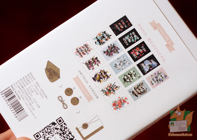 Набор из 30 открыток: Цветочные послания. Рисованные цветы и текст на английском. Набор упакован в коробку с суперобложкой. Плотный картон, лицевая глянцевая, покрытая водозащитным лаком, оборот матовый удобный для письма. На обороте разлиновка под адрес, индекс, место для марки. Качество хорошее. Размер открыток: 9.3 х 14.3см.