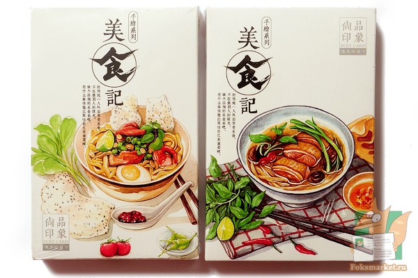 Набор из 36 открыток: Еда. Рисованые почтовые открытки на тему восточной кухни. Набор имеет упаковку с двумя разными рисунками, однако содержание одинаковое. Отправляются со случайной обложкой. Плотный белый картон, лицевая глянцевая, покрытая водозащитным лаком, оборот матовый удобный для письма. На обороте разлиновка под адрес, индекс, место для марки. Качество хорошее. Размер открыток: 9.3 х 14.3см.