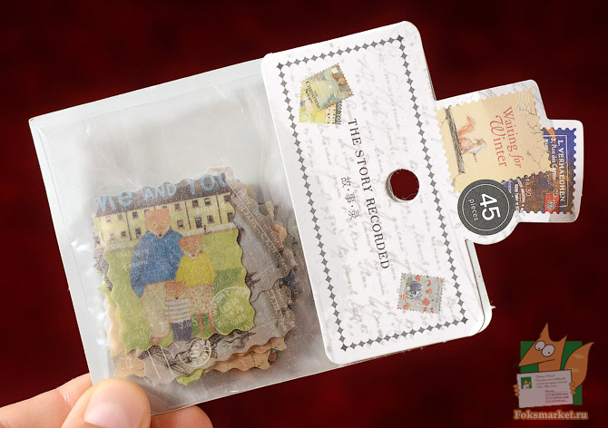 Набор наклеек в виде марок: Книжные иллюстрацииНабор наклеек в виде марок: Книжные иллюстрации. Очень стильнй набор наклеек в виде марок с винтажными иллюстрациями по мотивам детских зарубежных книг. В наборе 45 наклеек. Наклейки в виде марок, края волнистые. Нижний слой, подложка - прозрачная плёнка. Верхний слой, сама наклейка - гибридный бумажный материал. Имеет текстуру льняной бумаги, полупрозрачный как калька, однако верхний слой мягкий и поддатливый. При отгибании держит форму, напоминает материю на клеевой основе. Слой наклейки тонкий, клейкий слой сильный. Наклейки размером 3,5 х 4 см.