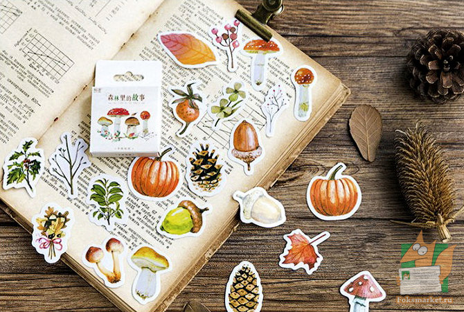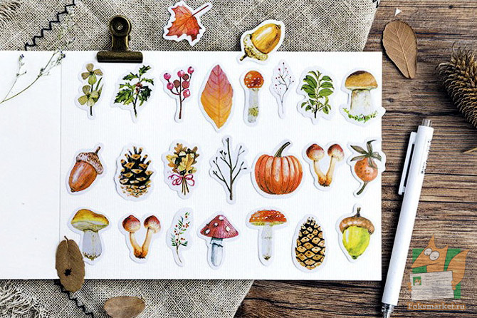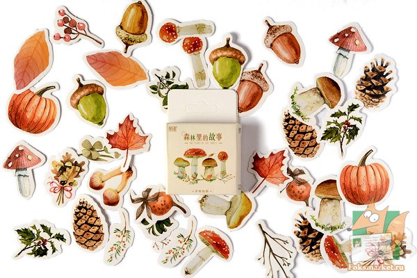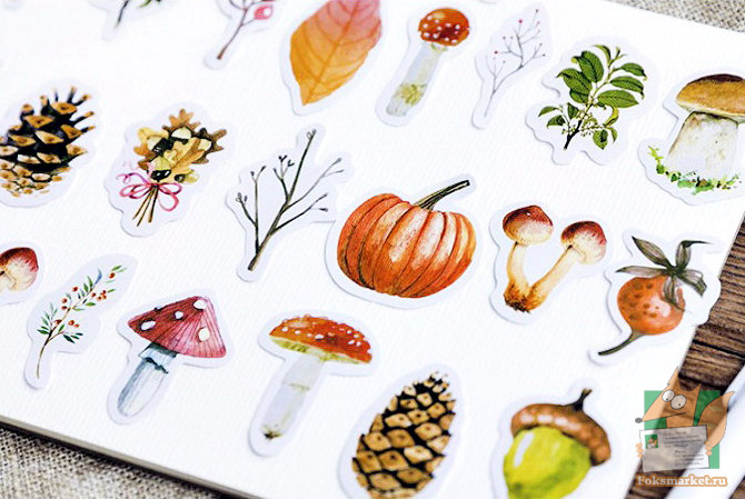 Набор из 46 наклеек: Царство грибов и растений. Фигурные наклейки с рисоваными дарами леса на бумажной основе. Здесь есть грибы, желуди, листья, шишки, веточки и т.д. Легко отклеиваются, не толстые, яркая печать. Можно использовать для посткроссинга, скрапбукинга, мейларта, клеить на почтовые открытки, в дневники или на другие предметы. Размер наклеек до: 4 х 4см.