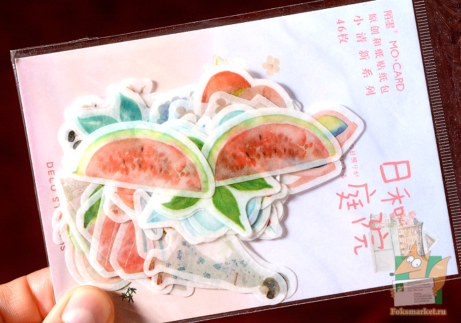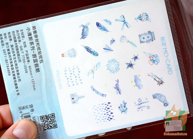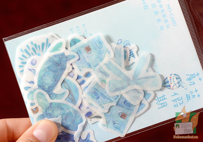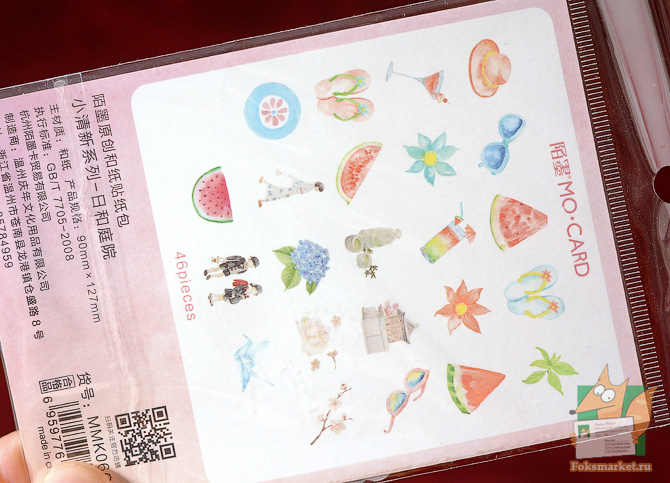 Наборы наклеек: Морской и Летний. Два вида наклеек по 46шт в каждой пачке. Размер наклеек разный, до 5см. Нижний слой, подложка - прозрачная плёнка. Верхний слой, сама наклейка - гибридный бумажный материал. Имеет текстуру льняной бумаги, полупрозрачный как калька, однако верхний слой мягкий и поддатливый. При отгибании держит форму, напоминает материю на клеевой основе. Слой наклейки тонкий, клейкий слой сильный. Изображение чёткое, не контрастное. Можно клеить на открытки, конверты и в ежедневники. Размер листа: 9 х 12,7 см. Набор Летний:
