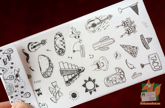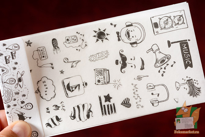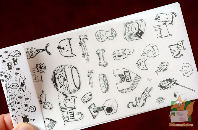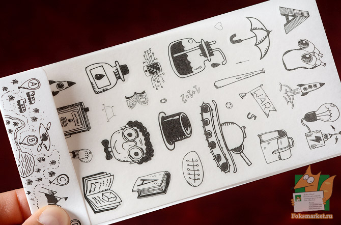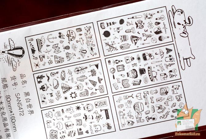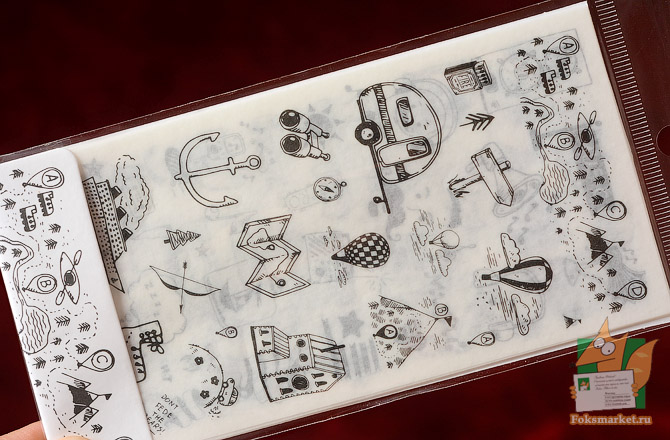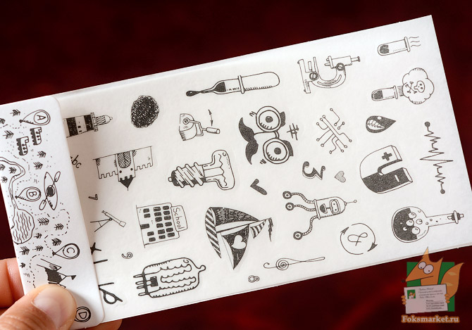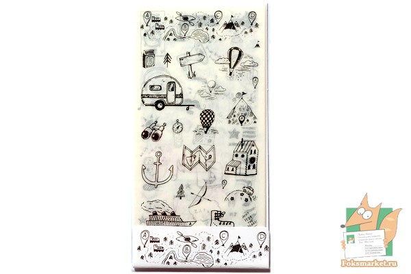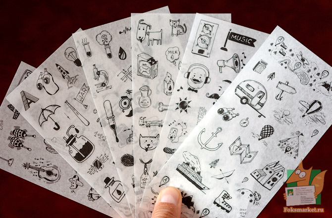 Наборы чб наклеек 6 листов: Путешствия, наука и питомцы. В наборе 6 листов черно-белых наклеек. Тематика разная, здесь есть и походы, и путешествия, и научные эксперименты, и любимые домашние животные, и музыка. Каждый элемент высечен, его легко отклеить. Нижний слой, подложка - прозрачная плёнка. Верхний слой, сама наклейка - гибридный бумажный материал. Имеет текстуру льняной бумаги, полупрозрачный как калька, однако верхний слой мягкий и поддатливый. При отгибании держит форму, напоминает материю на клеевой основе. Слой наклейки тонкий, клейкий слой сильный. Изображение чёткое, контрастное. Можно клеить на открытки, конверты и в ежедневники. Размер листа: 8 х 16 см.