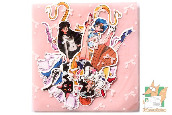 Набор наклеек: Девушки из аниме. В наборе 11 наклеек разных размеров, от 10*13см до 3*5см, в среднем довольно большие. Наклейки бумажные, на белом фоне. Размер упаковки: 14 х 14см.