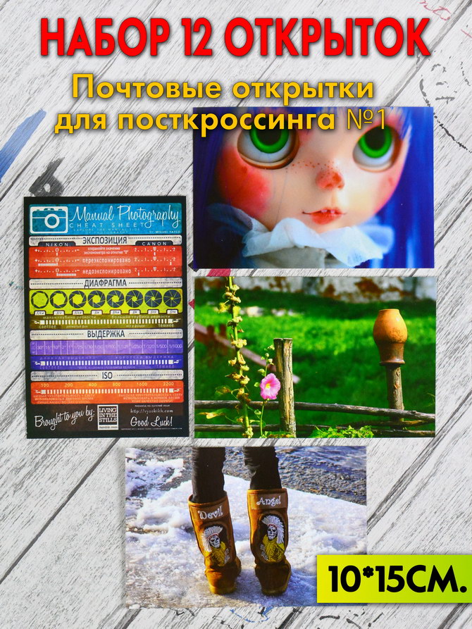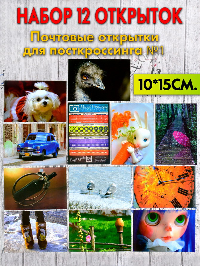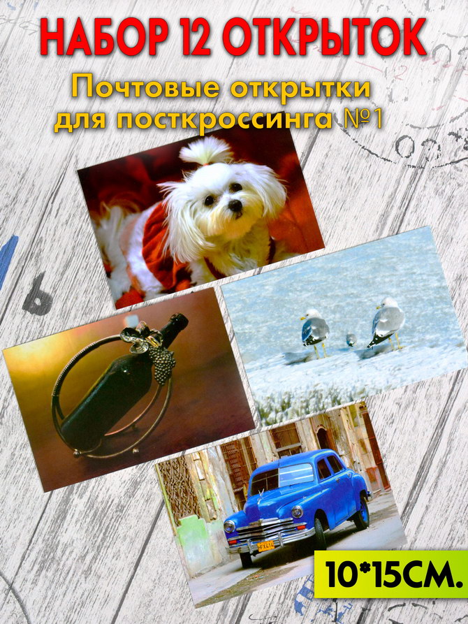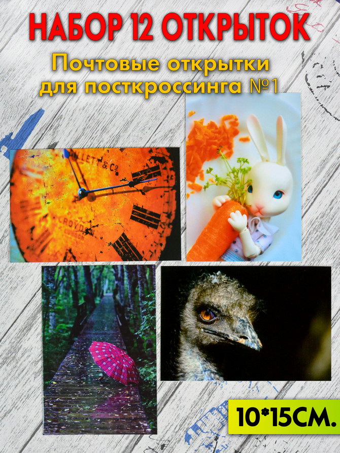 Набор из 12 почтовых открыток для посткроссинга. В наборе открытки на разную тематику, которые отлично подходят для отправки по почте в конверте или без него. Хорошее качество печати, приятный плотный картон с ламинацией, насыщеные краски. На обороте логотип и разлинейка под адрес. Набор упакован в целлофановый самоклеящийся пакет. Открытки отлично подойдут для посткроссинга или украсят коллекцию почтовых открыток. Также набор можно использовать для фотозон, украшения интерьера, создания коллажей, календарей с поздравлениями и т.д. В наборе есть открытка с куклой, игрушечной зайкой, кошкой, собакой, чайками на снегу. Также есть яркая открытка с розовым зонтом, деревенской изгородью, синим ретро автомобилем, циферблатом часов. Старинное вино, шпоргалка для фотографа, зимние сапожки с необычными надписями. А почему бы и нет? У посткроссеров порой возникают достаточно сложные задачи с оригинальными запросами коллег. И порой найти нужную почтовую открытку довольно сложно. Но когда все под рукой и есть из чего выбрать - это значительно упращает задачу. И хобби превращается в настоящий праздник. Открытки идеальны для подарка детям, бабушке, дедушке, маме, папе, подруге. Все, кто увлекается посткроссингом или любит собирать открытки, наверняка оценят такой подарок. Оригинальный дизайн и чудесные иллюстрации этих открыток позволяет использовать их для украшения интерьера, создания коллекции или настенного календаря с пожеланиями на каждый день. Посткроссинг, вечеринки, офисные праздники или личные поздравления – не важно, эти открыточки подходят к любому случаю и скрасят в качестве дополнения любой подарок. Набор открыток разной тематики подойдет для творчества и личных поздравлений. А еще эти открыточки созданы из плотного картона и будут радовать вас долгое время. Идеальный подарок для любимого человека или коллеги. Каждая открытка уникальна. Не упустите возможность порадовать себя красивыми открытками для создания уютной атмосферы в вашем доме или на рабочем месте.