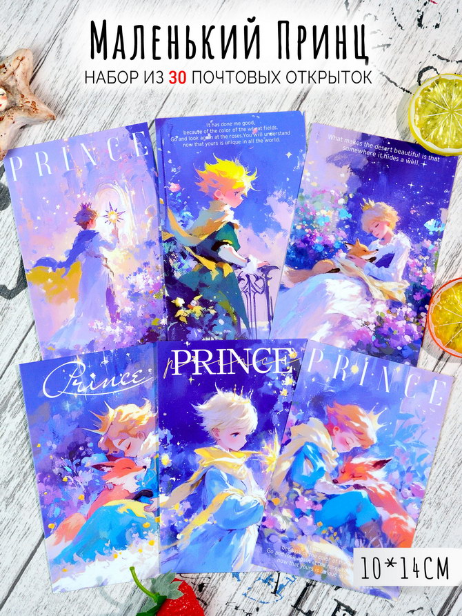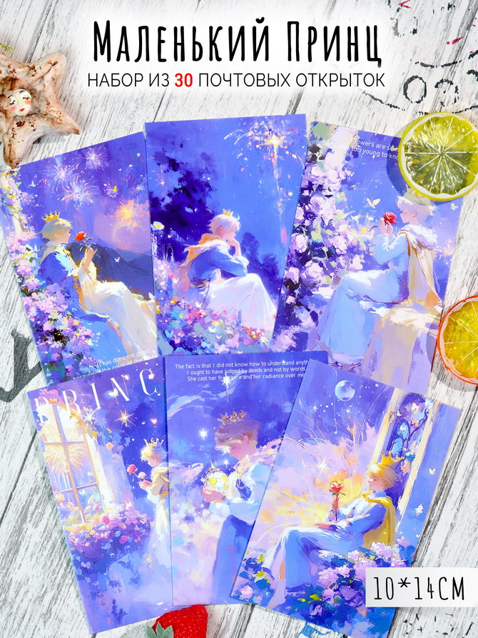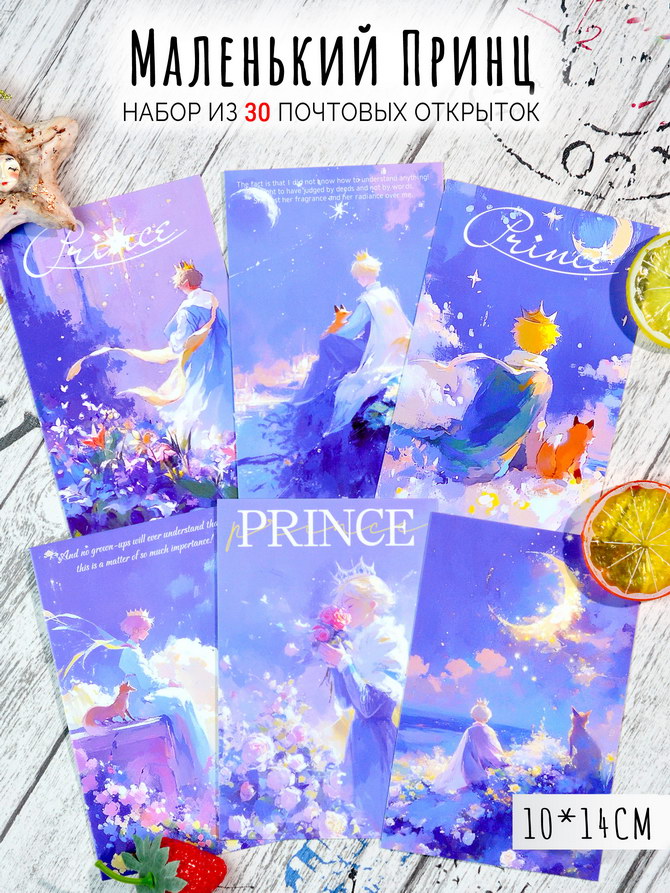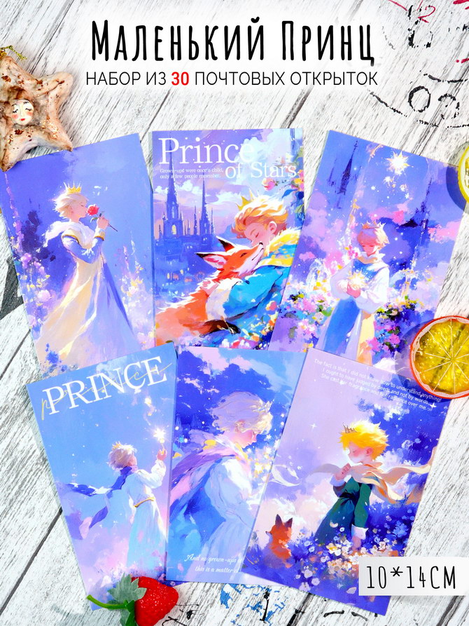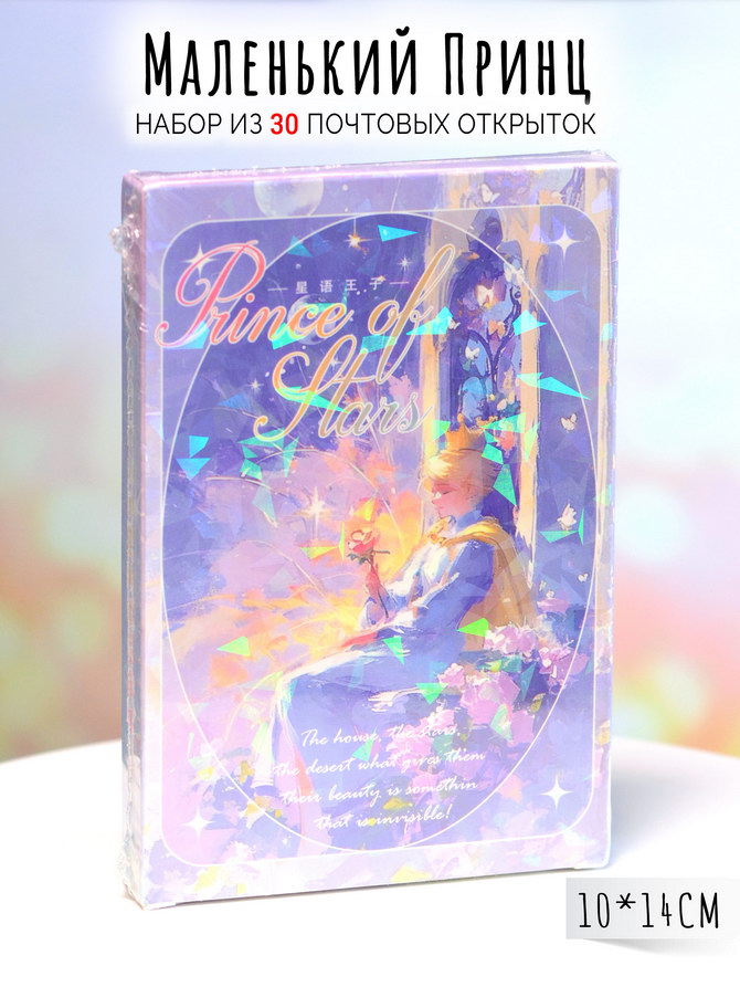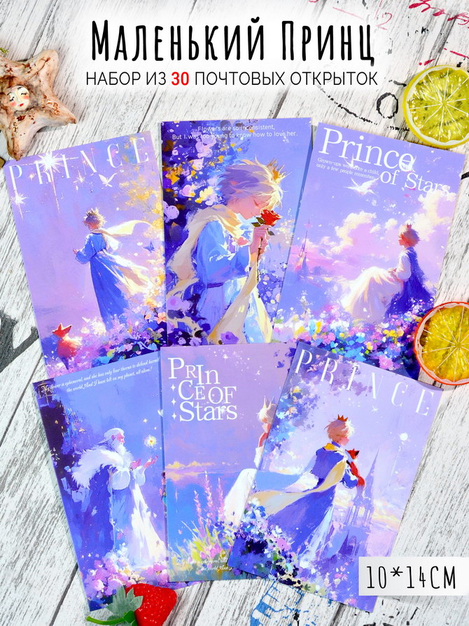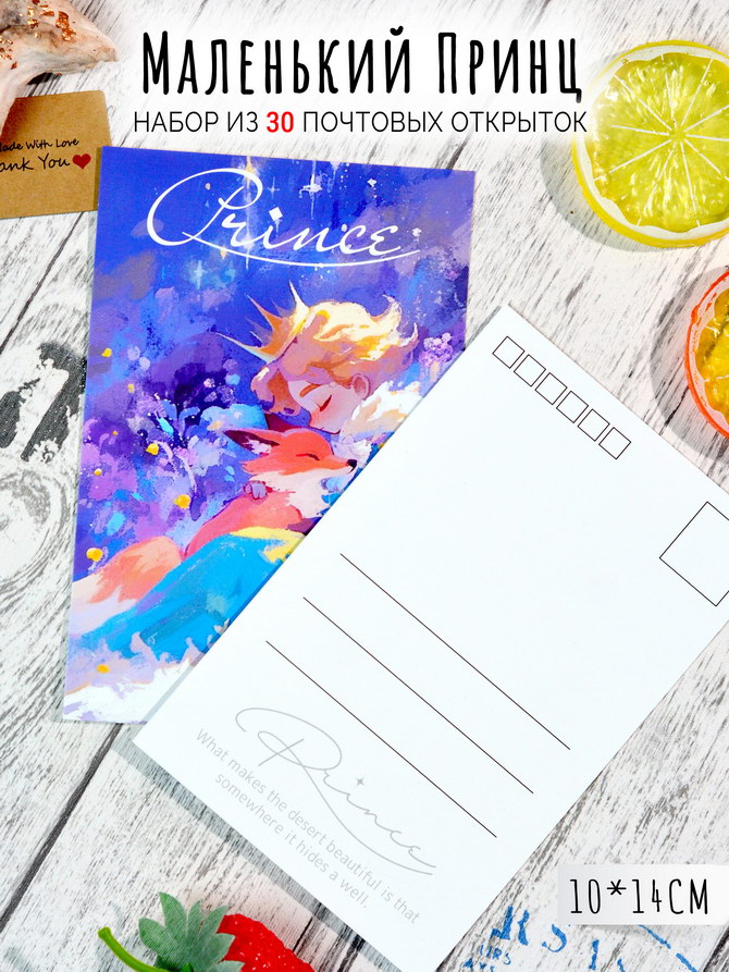 Набор открыток «Маленький принц»: волшебство в каждой детали! Погрузитесь в чарующий мир Антуана де Сент-Экзюпери с набором из 30 почтовых открыток, вдохновлённых культовой историей о Маленьком принце. Каждая открытка — это маленькое произведение искусства, наполненное светом, нежностью и философией знаменитой сказки. На открытках изображены трогательные сцены с Маленьким принцем и его верным другом — лисой. Художественный стиль сочетает пастельные тона с мягкими акцентами, создавая ощущение солнечного дня и детской беззаботности. Набор подойдёт не только для отправки писем, но и для украшения интерьера (например, размещения в рамке); использования в качестве закладок для книг; коллекционирования; творчества (скрапбукинг, посткроссинг, декор альбомов). Плотный белый картон, лицевая глянцевая, покрытая водозащитным лаком, оборот матовый удобный для письма. На обороте разлиновка под адрес, индекс, место для марки. Размер открыток: 9.8 х 14.8см.