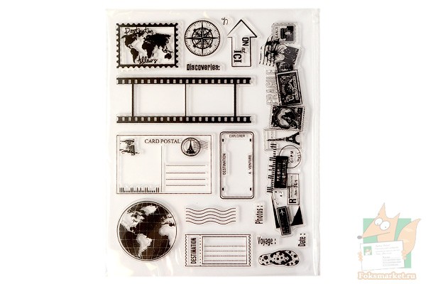 Набор штампов: Путешествия. Силиконовые прозрачные мягкие штампы для оформления почтовых открыток, дневников, писем, скрапбукинга и т.д. Каждое изображение в наборе идет как отдельный штамп. Все штампы наклеены на защитную плёнку с которой перед использованием снимаются и переклеиваются на прозрачный акриловый блок или другой подходящий предмет с гладкой поверхностью, в результате чего получаем штамп готовый к использованию. Штамп прижимают к штемпельной подушке или губке смоченной чернилами и ставят оттиск на почтовой открытке, в дневнике и др.